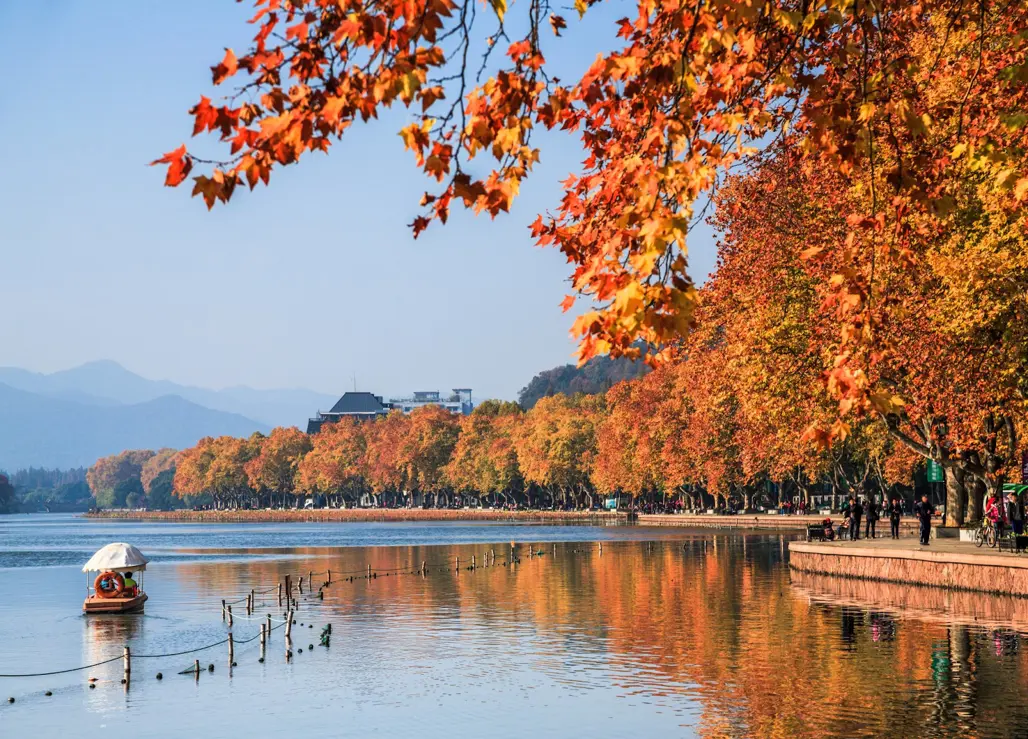 Buổi chiều : ngồi thuyền thưởng ngoạn Tây Hồ - được xem là đẹp và nên thơ nhất trong hơn 36 hồ có cùng tên ở Trung Quốc, nhìn ngắm Quả sơn, Đoạn kiều, Trường kiều, Tô Đê Bạch Đê, Tam Đàn Ấn Nguyệt và Hoa Cảng Quan Ngư (bên ngoài) gắn liền với những truyền thuyết về Lương Sơn Bá - Chúc Anh Đài, nhà thơ Lý Bạch, Thanh xà - Bạch xà.